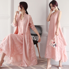 2017新款复古韩版长款两件套连衣裙女名媛欧根纱长袖裙套装长裙