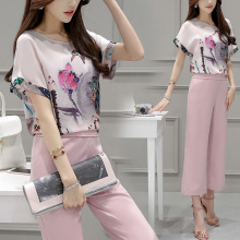 2017新款女装夏装裤两件套韩版粉色雪纺短袖九分裤休闲时尚套装女