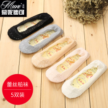 夏季薄款蕾丝隐形船袜女士春秋无痕浅口纯棉短袜丝袜不掉跟5双装