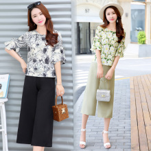 2017夏装新款女装潮短袖碎花雪纺衫气质显瘦套装女阔腿裤两件套裤