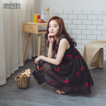 欧薇娅2017新款无袖连衣裙夏a字裙甜美小清新修身樱桃刺绣女中裙