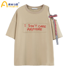2017夏装新款韩版圆领字母小心机露肩上衣学生刺绣宽松短袖T恤女