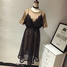 韩国东大门2017夏季中长款短袖T恤+镂空网眼吊带连衣裙两件套装