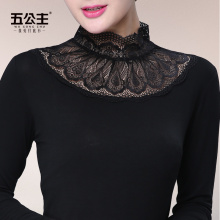 五公主秋装高领蕾丝网纱打底衫黑色拼接长袖女蕾丝衫秋季薄纱衣新