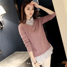 春装新款2017韩版宽松套头衬衫领拼接毛衣假两件套女装外套针织衫