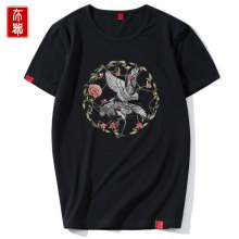布器 民族风格男装短袖T恤夏季白鹤印花时尚个性潮款中国风体恤衫