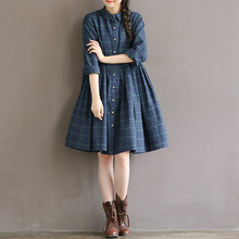 森女系2017春装季新款大码文艺小清新格子连衣裙中长款学生衬衫裙