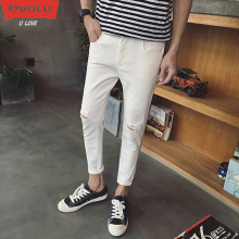 权志龙同款纯色破洞牛仔裤男夏青少年紧身九分裤小脚裤子潮乞丐裤