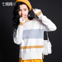 七格格2017春装新款条纹圆领毛衣女套头下摆侧开叉宽松百搭针织衫