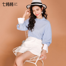 七格格2017春季新款韩版个性袖口小清新蓝格子长袖衬衫女上衣M161