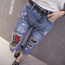 夏韩高腰显瘦小脚破洞裤紧身玫瑰刺绣渔网大破洞卷边七分牛仔裤女