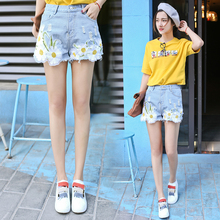 太阳花短裤女夏季百搭小清新刺绣花朵牛仔短裤学毛边破洞学生热裤