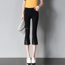 七分蕾丝拼接微喇裤2017夏季紧身黑色打底裤大码百搭女士休闲中裤