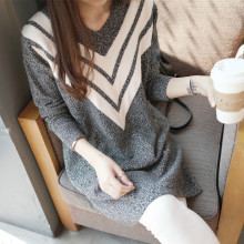 2016秋冬新款女士毛衣韩版中长款V领拼色宽松针织打底衫套头毛衣