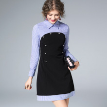 欧洲站2017春装新品清新百搭长袖显瘦翻领条纹衬衫钉珠淑女连衣裙