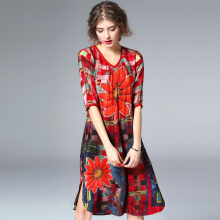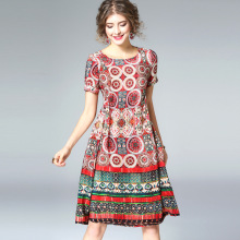 大码连衣裙女夏2017新款女装欧美时尚民族风印花宽松真丝桑蚕丝裙