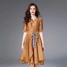 天天特价 欧洲站名媛气质修身显瘦系腰带V领中袖丝麻外贸连衣裙