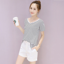 夏季韩版V领短袖T恤女黑白条纹宽松体恤半袖打底衫修身夏装上衣潮