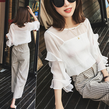 小清新东大门夏装新款女装韩国白色衬衫上衣显瘦优雅小衫雪纺衫