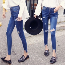 张大奕高腰韩版破洞弹力百搭铅笔裤修身显腿细蓝色小脚牛仔裤女