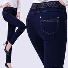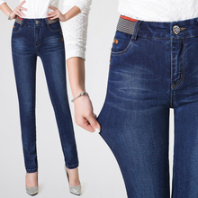 2016春装新款高腰小直筒牛仔裤女式弹力修身显瘦中年大码小脚裤子
