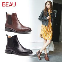BEAU春季切尔西短靴女平底真皮马丁靴女英伦风及踝靴粗跟女靴子