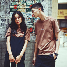 侑模原创春夏新品文艺范字母印花咖啡色情侣短袖T恤男女班服潮tee