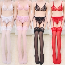 热卖女士性感蕾丝吊袜带长筒袜缕空女袜粉白色含网袜四件套装