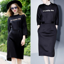 欧洲站2016春夏装新款走秀款黑色简约大牌设计收腰五分袖连衣裙子