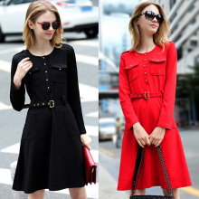2017春季新款中长款长袖高腰连衣裙 欧美风走秀款气质女裙配腰带