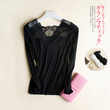 超薄款性感蕾丝拼接莫代尔T恤长袖上衣 女美体修身外穿春秋打底衫