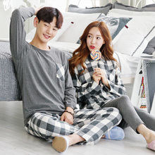 梦依情春秋季情侣睡衣纯棉长袖 男女士韩版格子休闲家居服套装