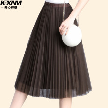 新款网纱半身裙 秋冬中长款黑色高腰百褶裙蓬蓬A字裙纱裙女裙