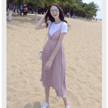 孕妇夏装时尚潮妈长款雪纺百褶吊带连衣裙+短袖t恤两件套孕妇套装
