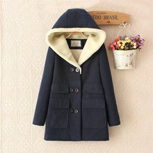 2016冬装新款日系森女学院风连帽羊羔绒双口袋加厚毛呢大衣外套女