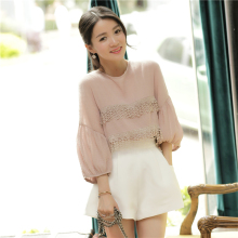 TUTUFEEL 2017新款夏装 蕾丝刺绣拼接肉粉色宽松灯笼袖雪纺衫