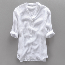 中国风亚麻衬衫男士七分袖衬衣青年夏季薄款亚麻寸衫宽松休闲上衣