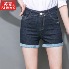 苏麦2017夏新款印花卷边翻边显瘦修身大码高腰牛仔裤短裤女士热裤