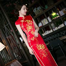 2017夏新娘结婚敬酒服红色绣花长款舞台演出改良复古大码刺绣旗袍