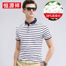 恒源祥桑蚕丝短袖t恤男 2017夏季真丝条纹翻领体恤衫中年爸爸男装