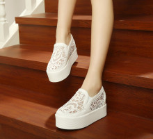 春夏白色厚底帆布鞋女低帮蕾丝透气网纱镂空乐福鞋松糕内增高板鞋