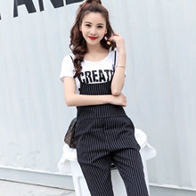 连体裤女2017夏装新款韩版大码背带阔腿裤休闲裙裤条纹短袖两件套