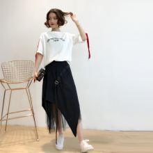 2017夏季新款高腰不规则网纱裙下摆黑色百搭中长款学生拼接半身裙