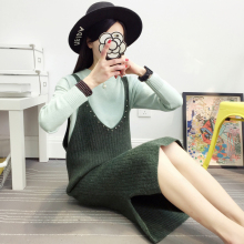 2017春装新品针织V领背心裙学院风中长款背带连衣裙吊带毛衣裙女