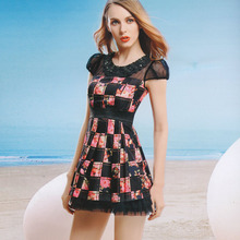 妮可秀朵2017夏季新款高端拼接蕾丝连衣裙女短袖裙子女夏薄修身
