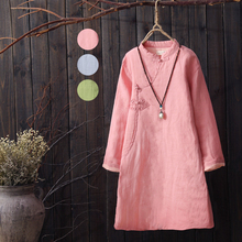 复古盘扣连衣裙长袖中式上衣中长款文艺范棉麻布衣春女装立领修身