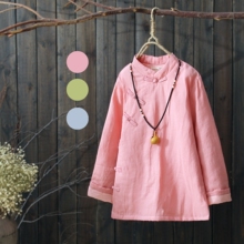 复古文艺范中式九分长袖棉麻盘扣上衣中长款宽松衬衫民国风女装春