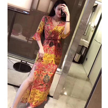 欧洲站2017夏季新款印花荷叶袖松紧腰真丝开叉时尚显瘦长裙连衣裙