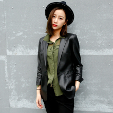 欧洲站2017新款袖口刺绣真皮皮衣绵羊皮短款修身七分袖西装外套女