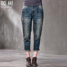暖树春装新款 个性水洗抓纹高腰休闲宽松小脚牛仔裤女九分裤大码
